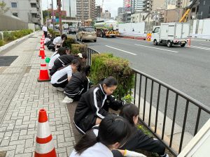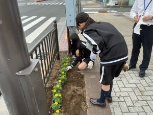 1年生が、校舎前の国道に植栽をしました。この歩道は国土交通省の管理下にあり、勝手に植物を植えたり抜いたりしてはいけないのですが、ご縁があってお話をいただき、こうしてときどき、協力させていただいています。 生徒たちも、少しでも近隣のお役に立てばという思いでやっていて、道行く方からありがとうと、声をかけていただくことが励みになっています。