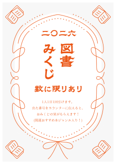 図書室日記 図書みくじ 2026.1.08 新学期が始まりました。 図書室では「図書みくじ」を始めました。 1人1日1回まで引けます。 出た数字をカウンターに伝えると、開運おすすめ本ジャンル付きのおみくじ風の栞がもらえます! なくなり次第終了です。 新年もぜひ図書室へ! 図書室 伊達木 2026.1.08 [図書室日記]