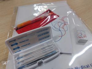 特別講座の参加者にいただいた大学オリジナルのノベルティ。手前のファースト・エイド・キットは、持ち歩きにもちょうど良いサイズ感で、とても実用的ですね。
