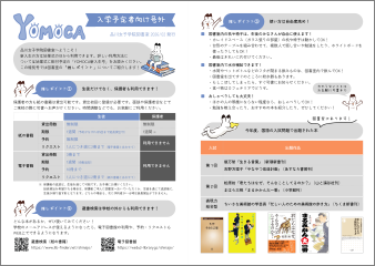 先日の入学予定者登校日に図書室へお立ち寄りいただいた方向けに、お土産としてYOMOCA(図書室だより)号外としおりをご用意していました。