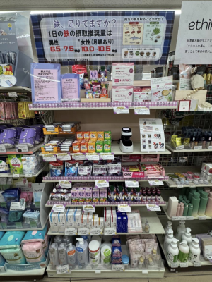 まずセブン-イレブン川崎登戸駅前店の店頭では、鉄分を補える商品を集めた特設コーナーを設置し、生徒たちが作成したポップを掲示しました。さらに太陽化学株式会社様のお力添えにより、鉄不足を確かめられるチェックリストも作成し展示しました。